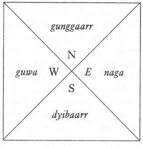 Així en guugu-yimidhirr per a la localització espacial fan servir quatre termes, que aproximadament es corresponen a les quatre direccions cardinals que es veuen en el gràfic de sota.
