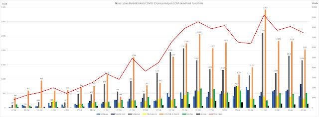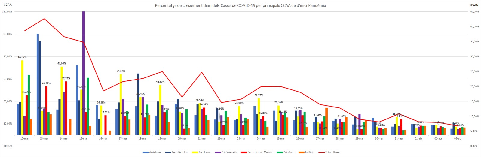 From the analysis of this graph, it can be deduced that the situation is getting better and better since the daily increase in new cases is beginning to be below 7% in the major Autonomous Communities and the whole state. In the early days of the pandemic, values had increments well above 70, 90 and even 100% in some territories. We must bear in mind that we are talking about percentage and therefore relative values.