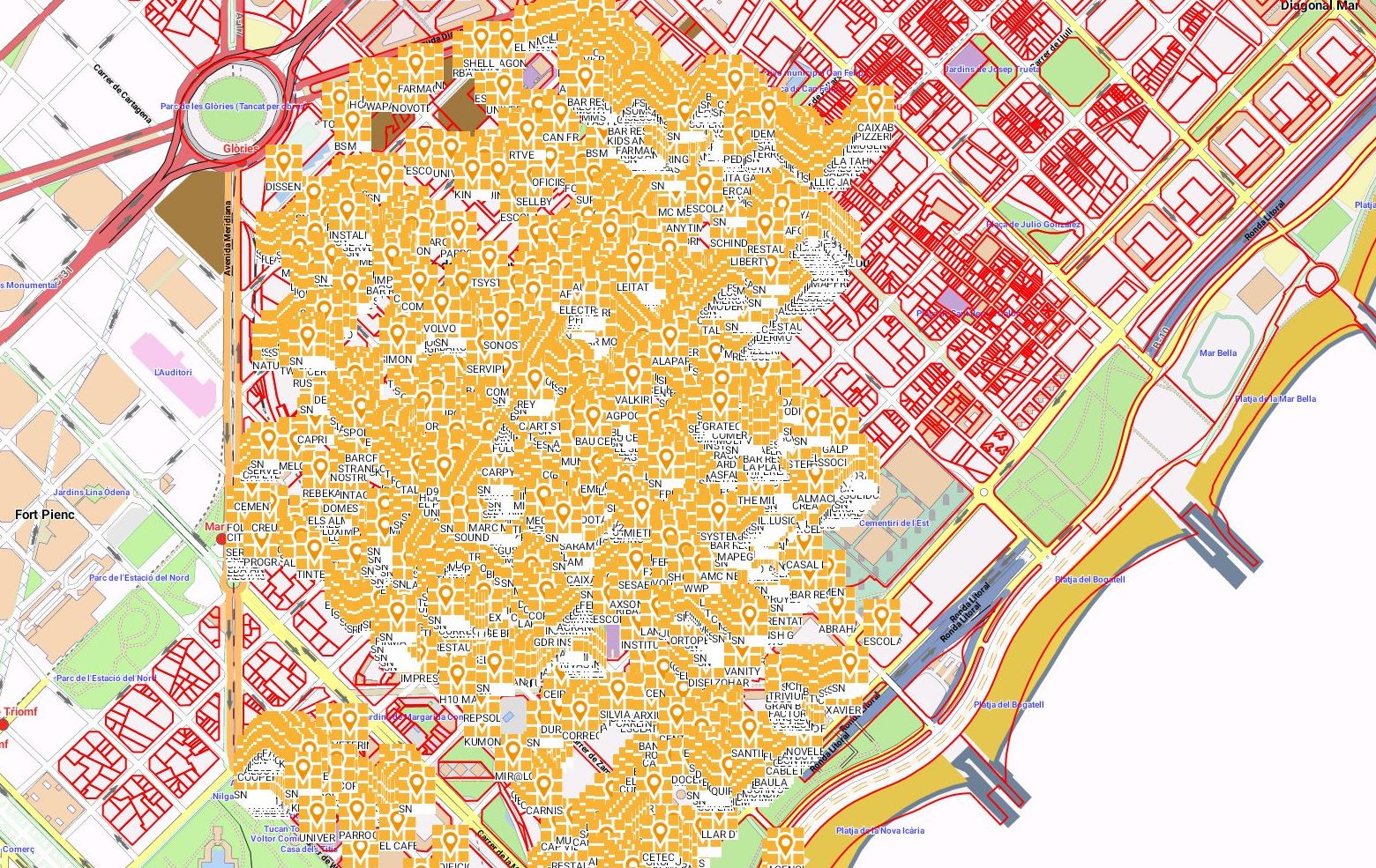 Hem desenvolupat un aplicatiu que carrega cartografia offline de base d’Open Street Map amb la divisió cadastral de cada districte de la ciutat de Barcelona. Durant el treball de camp anem ficant un punt per cada establiment que trobem.